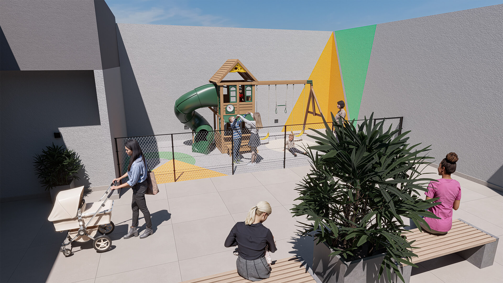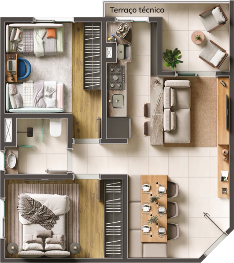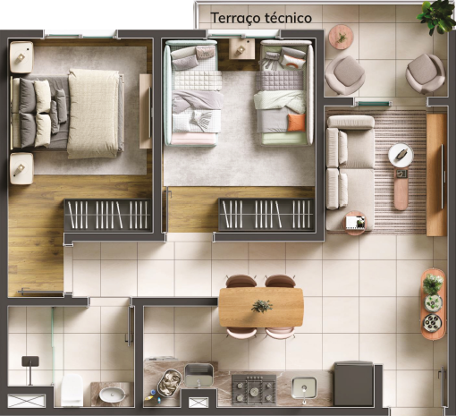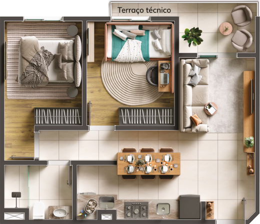 As imagens, perspectivas e ilustrações contidas neste material são meramente ilustrativas e têm como objetivo apresentar uma sugestão de ambientação e acabamento. Os móveis, objetos de decoração e itens de paisagismo representados não fazem parte do contrato. As unidades serão entregues conforme o memorial descritivo. As fachadas, áreas comuns e demais elementos visuais poderão sofrer ajustes durante o desenvolvimento do projeto executivo e da obra, respeitando os parâmetros legais e técnicos. Sujeito a alterações sem aviso prévio.